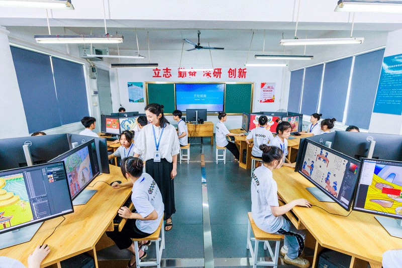 学校有陶艺实训室2间、印前制作工作室、动漫设计实训室2间、服装工艺制作室2间、画室8间、美容美发与形象设计室、电脑室7间、多媒体教室5间、摄影制作室、首饰制作室。
