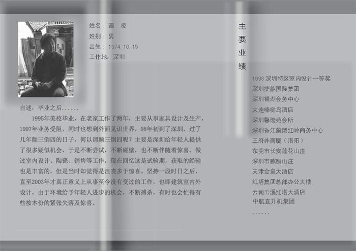 1991 年进美校,1995年毕业,在老家工作了两年,主要是做家具设计及生产,之后业务受阻,同时也想到外面见识世界,于是在98年初到了深圳,过了几年颠三倒 四的日子,何以谓颠三倒四呢?主要是深圳给年轻人提供了很多疑似机会,于是不断尝试,不断碰壁,也不断伴随着惊喜。做过室内设计、陶瓷、销售等工作,现在 回忆这是试验期,获取的经验也是丰富的,但是当时却觉得是沮丧多于惊喜。坚持一段时日之后,直至2003年才真正意义上从事至今没有变过的工作,也即建筑 室内外设计,由于环境给予年轻人进步的机会,不断搏杀,有时也会忙得有些按本份的紧张失落及惊喜。近年减少了工作量,深感墨水不够,其中也有家庭的欣喜负 重,便适当停下来,抬头看天,然后低头走路,创造机会拜会各辈师友,读一些书,大家分享一些心得,充实了知识,也增进了友谊。有机会的话,也做一些力所能 及的旅行学习,脚步慢下来,其实也是拳头收回来,出击更为迅猛有力。