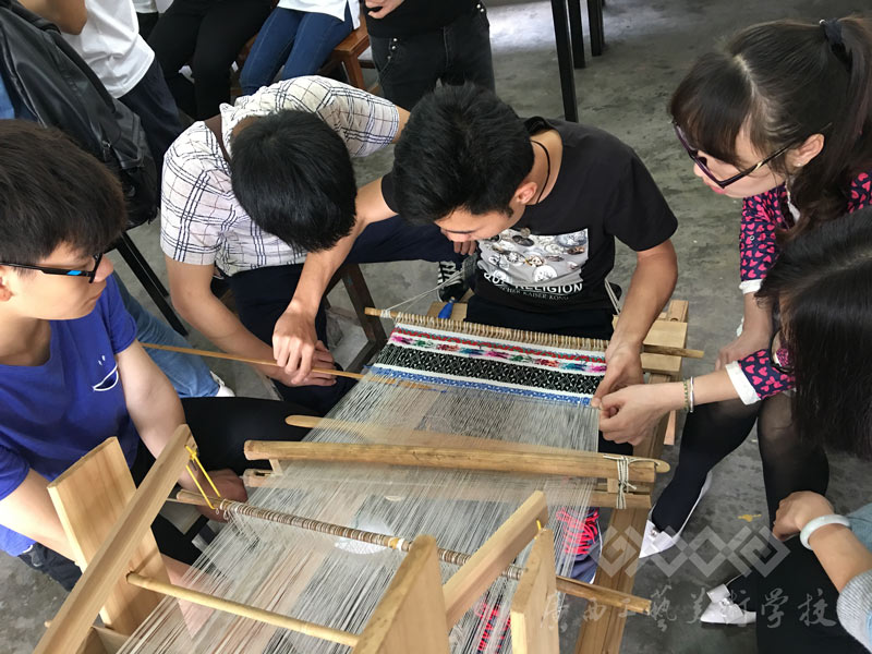我校工艺班、服装班的学生与专业老师一同向韦清花大师学习织锦