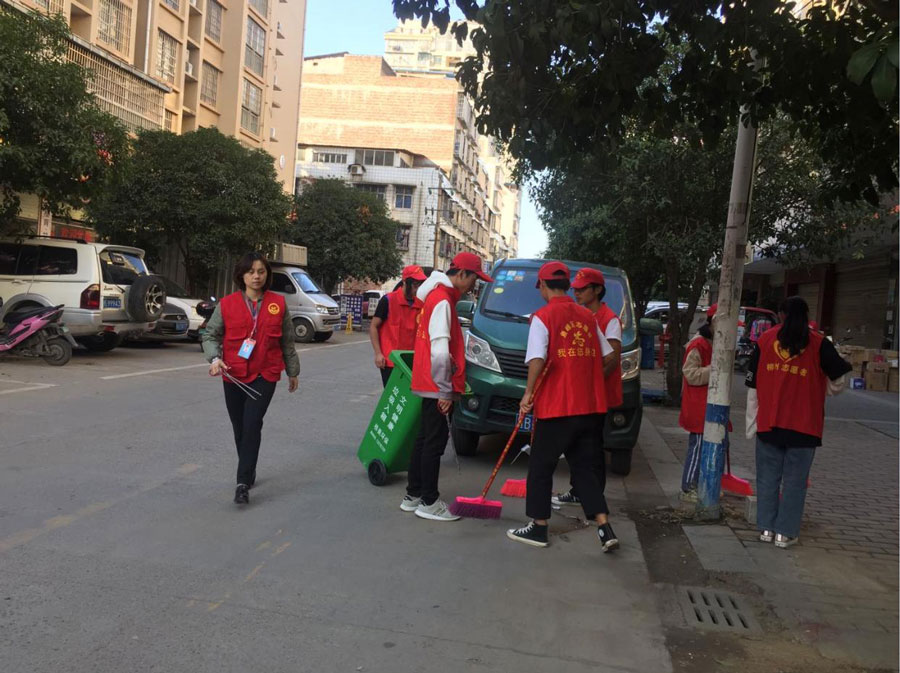 我校师生志愿者通过在小区、街道清扫垃圾,用实际行动在社区居民中倡导城乡清洁、生态保护、低碳生活的环保理念,引导他们在日常生活、学习和工作中自觉爱护环境、保护环境,携手建设美好家园。