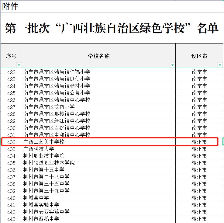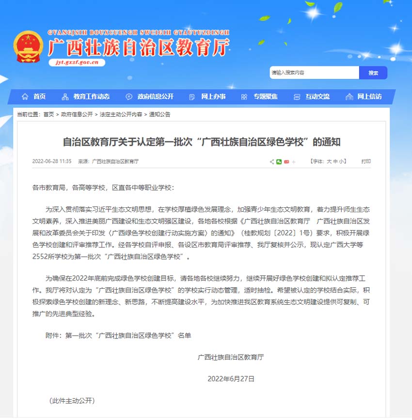 近日,自治区教育厅公布了《第一批次“广西壮族自治区绿色学校”名单》,经学校自评申报,各设区市教育局评审推荐,自治区教育厅复核并公示,我?;衿牢谝慌巍肮阄髯匙遄灾吻躺!薄?/p>