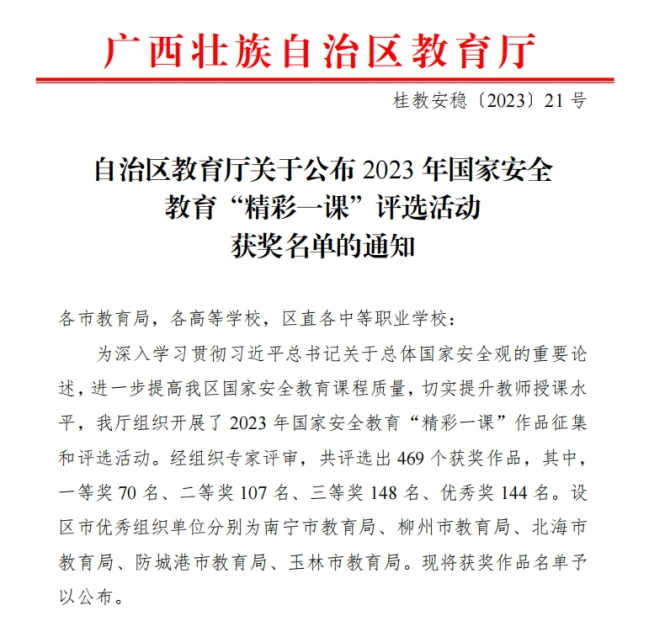 近日,2023年国家安全教育“精彩一课”评选活动等多项比赛活动的获奖名单公布。我校教师积极参与,表现突出,收获佳绩。
