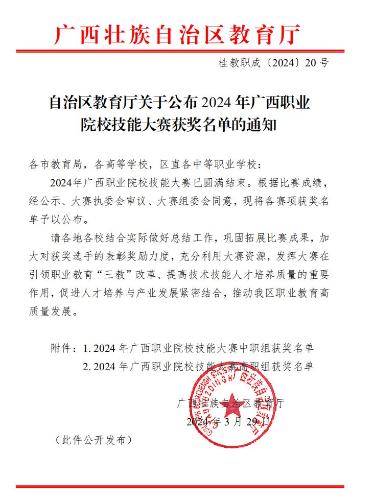 近日,自治区教育厅发布《关于公布2024年广西职业院校技能大赛获奖名单的通知》(桂教职成〔2024〕20号)。我校在今年的技能大赛中收获一等奖1个、二等奖3个、三等奖1个,实现了预期目标。