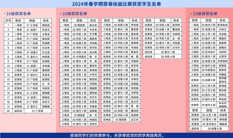 ? ? ? ?禁毒绘画比赛结束了,可是禁毒的脚步从未停止。我校将不断丰富禁毒教育内容,拓展禁毒教育资源,创新禁毒教育形式,完善禁毒教育管理,推动毒品预防教育制度化、均衡化、科学化发展。