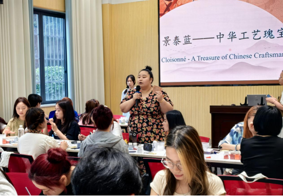 ? ? ? ?在景泰蓝手工体验环节,我校中级工艺美术师徐越老师详细介绍了景泰蓝的定义起源、制作工艺、艺术特色、发展传承,使留学生们对中国传统工艺的杰出代表景泰蓝有了初步认识。