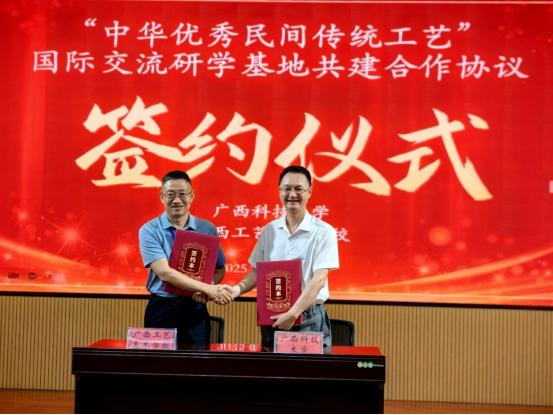 ? ? ? ?活动首先在报告厅开展合作共建签约仪式,仪式上,学校副校长龚志婧代表我校做欢迎辞,她希望通过两校合作共建“中华优秀民间传统工艺”校外研学基地,开展此次研学体验活动,能让留学生们更直观地领略到中华优秀民间传统工艺的独特魅力。广西科技大学国际教育学院院长尹辉俊代表科技大表示,双方院校秉持“优势互补、合作共赢”的理念,以研学体验活动为载体,进一步加强多方面的合作。随后,我校党委书记、校长赵小勇与广西科技大学国际教育学院院长尹辉俊共同进行合作共建签约仪式。