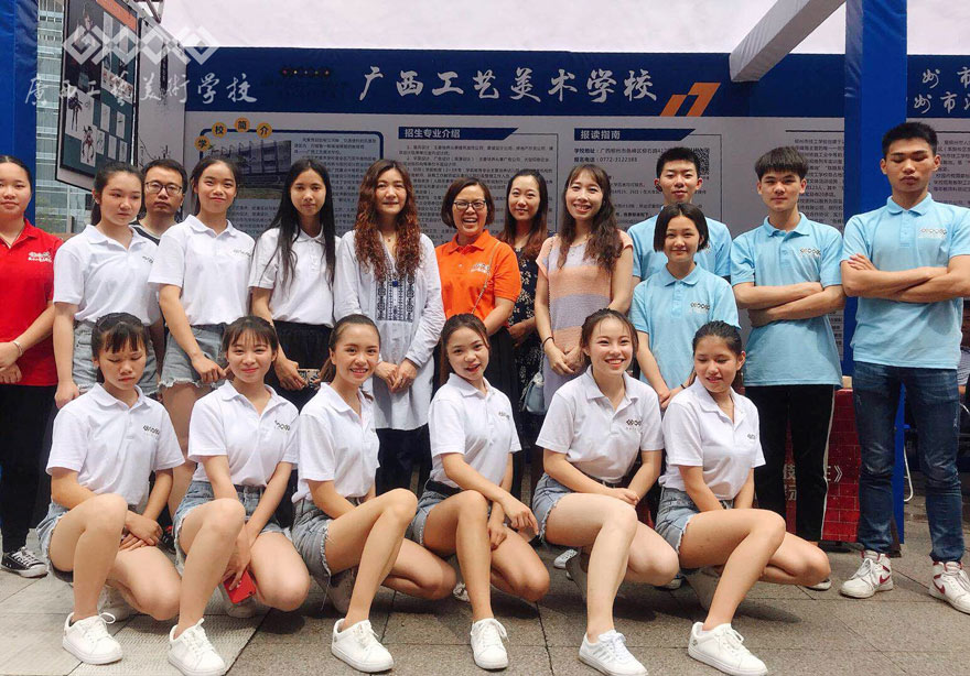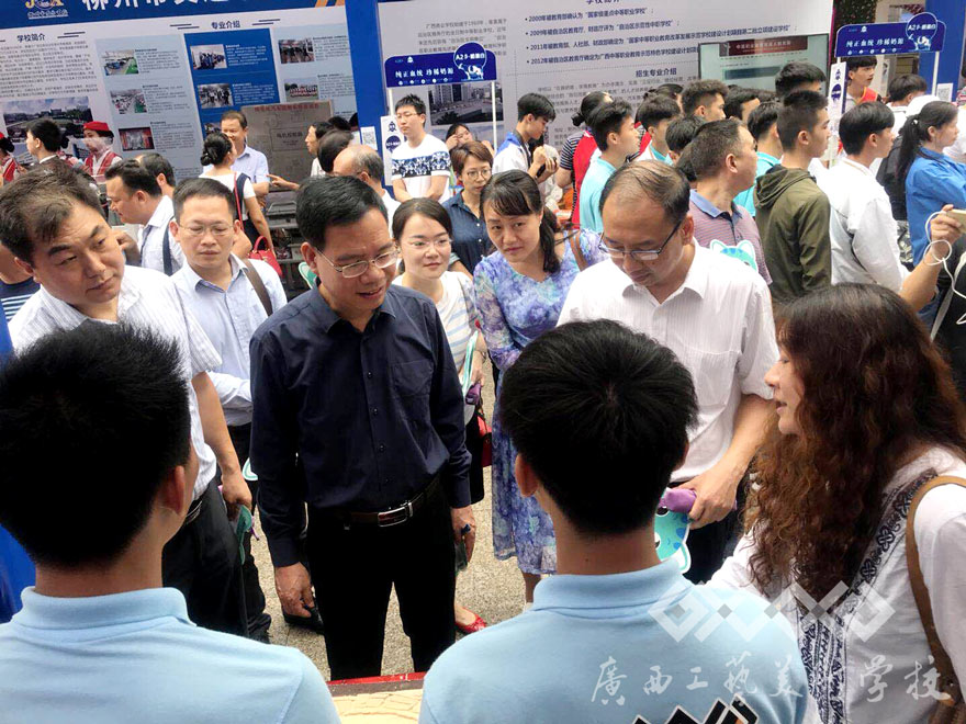 市教育局局长姚尹意、副局长潘旭阳,市文新广局副局长、柳州电视台台长林明波到我校展位参观
